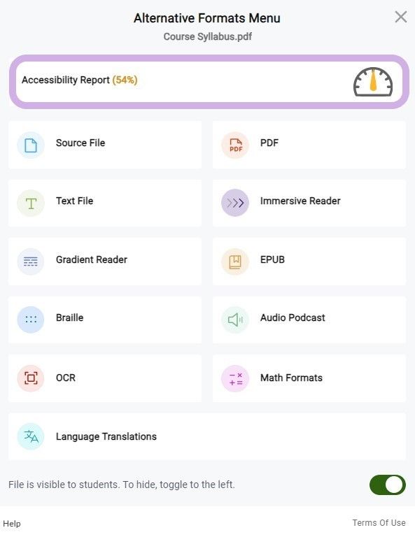 For a more detailed breakdown of the accessibility score, click on the Accessibility Badge to open the Alternative Formats menu. (The area to open is noted in the image below with a purple circle surrounding the area.)