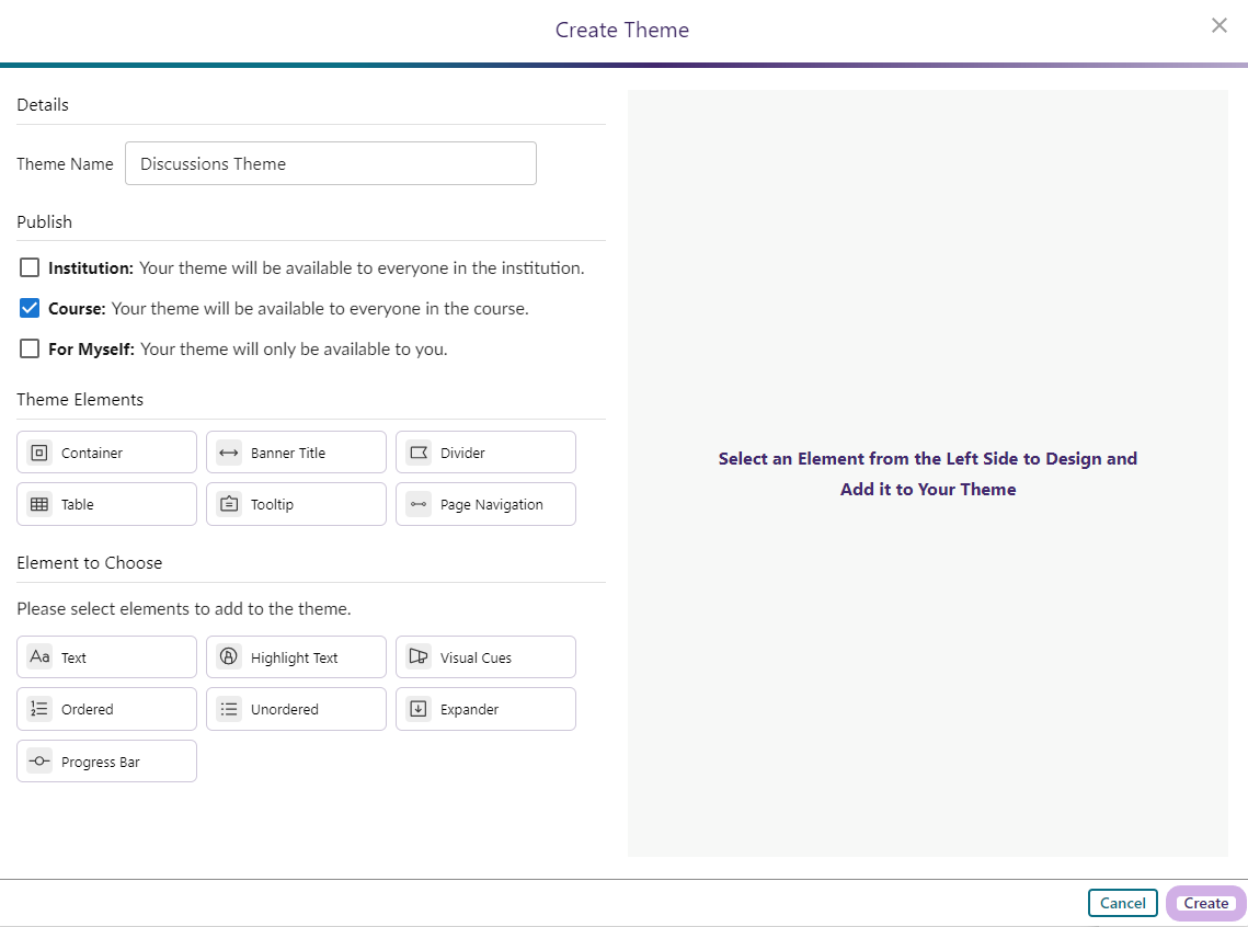 Once all desired elements have been styled, click Create to save your elements as a Theme.